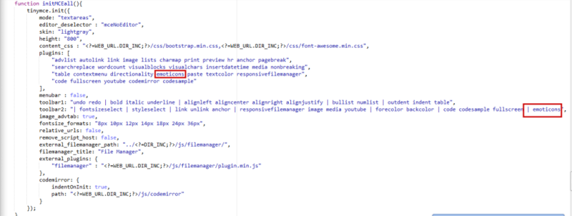 Lalu silahkan gulir kebawah, pada bagian javascript editor tinymce. Pada baris toolbar1 atau toolbar2 silahkan tambahkan "emoticons", demikian juga lakukan hal yang sama pada javascript editor tinymce yang ke 2. Perhatikan gambar 1.2