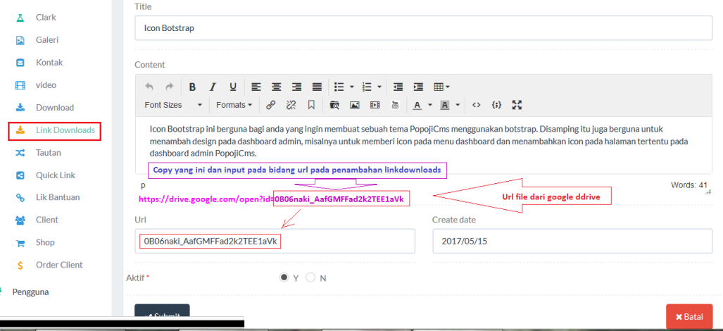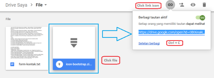 Untuk menyediakan file agar dapat diunduh pengguna, terlebih dahulu file tersebut harus di unggah di google docs. Setelah proses unggah selesai, rubah pengaturan akses file tersebut menjadi public, lalu copy link url yang tersedia. Selanjutnya paste link url tersebut pada editor text yang di miliki, ambil atau copy ulang hanya "id" saja. Untuk lebih jelas silahkan perhatikan gambar berikut: