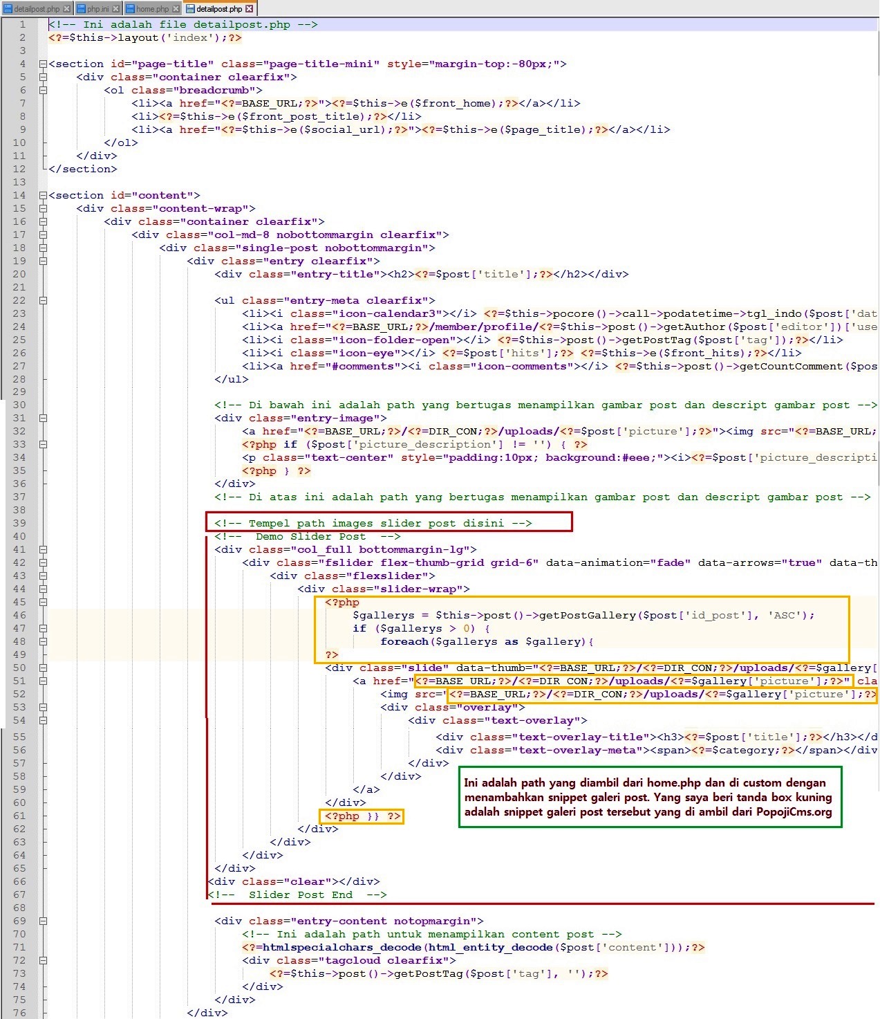 Silahkan ambil snippet untuk menampilkan slider post di official website PopojiCms pada menu dokumentasi v.2.x.x/Helper Tema/Gulir kebawah sampai anda temukan "Snippet image slider post". Custom dan sesuaikan pada file detailpost.php pada path yang baru saja anda copy dari home.php, lihat gambar diatas baik-baik.