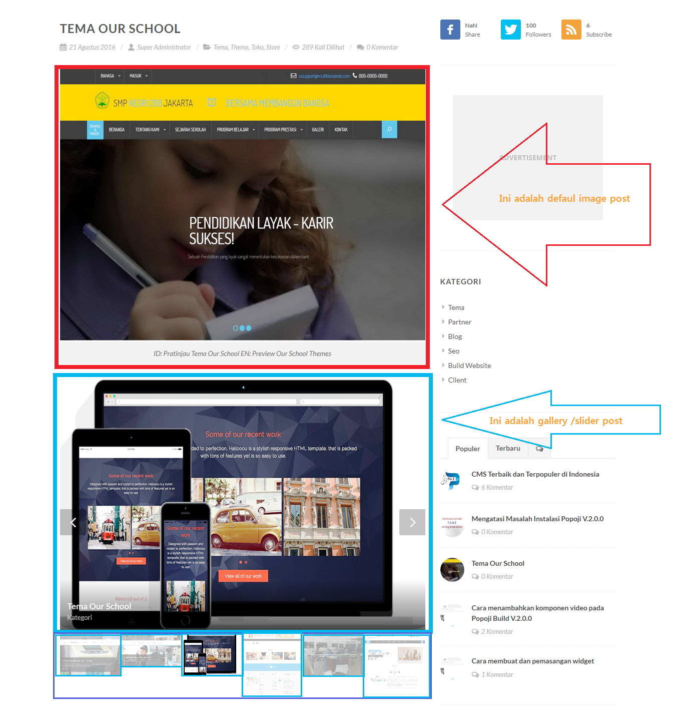 Untuk hasil kerja diatas dengan tanpa menghhilangkan salah satunya, berarti penggunaan gambar post dan galerry post. Silahkan lihat demonya melalui link dibawah ini: