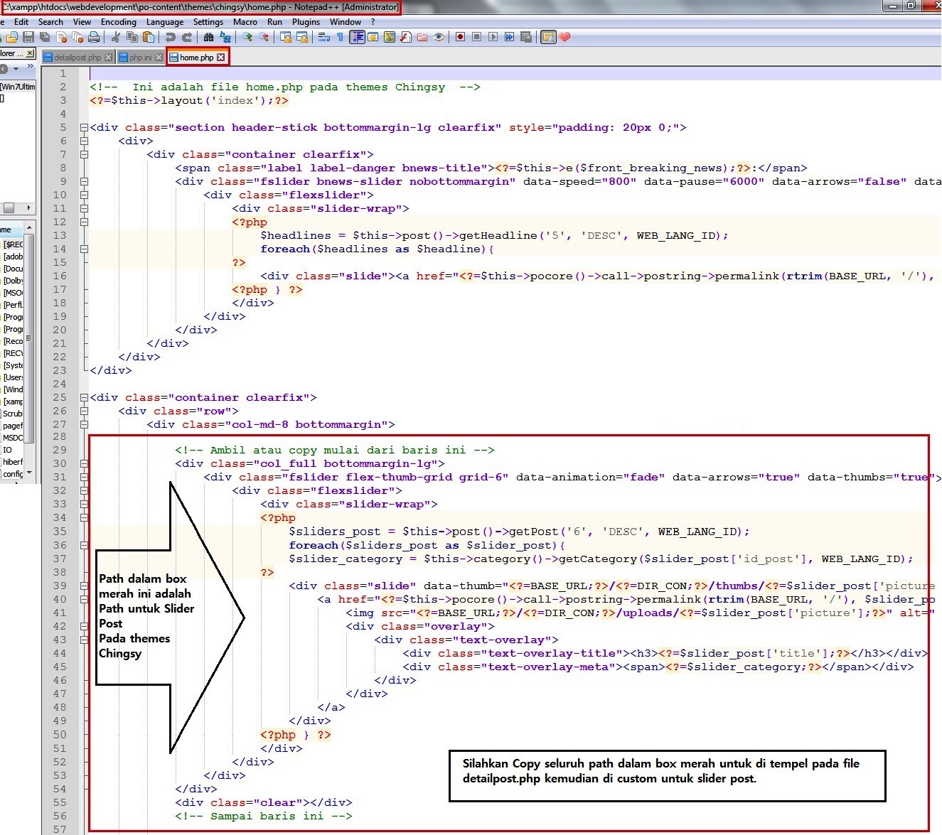 Pada contoh Membuat galeri atau slider Post ini kita tetap mengambil contoh atau mengacu pada themes chingsy sebagai themes defauld PopojiCms. Pada themes chingsy kita memiliki file home.php dimana pada file tersebut terdapat path untuk menampilkan slider berdasarkan ID post terbaru. Silahkan buka file tersebut(home.php theme Chingsy), buka juga file detailpost.php theme yang sedang digunakan. Sekarang ambil atau copy path dari home.php theme Chingsy yang bertugas menampilkan post terbaru sebagai slider. Kemudian tempel pada file detailpost.php theme yang sedang di gunakan untuk Membuat galeri atau slider Post, tempel dibawah atau diatas path untuk menampilkan gambar post.