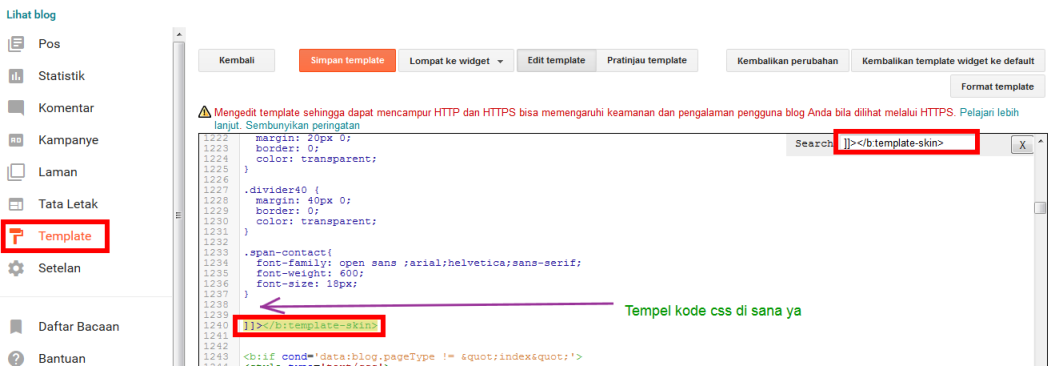 Setelah teman-teman menemukan kode tersebut, copy kode css dibawah ini lalu tempel di atas kode yang tadi teman-teman cari, jika sudah silahkan klik save, lihat gambar berikut: