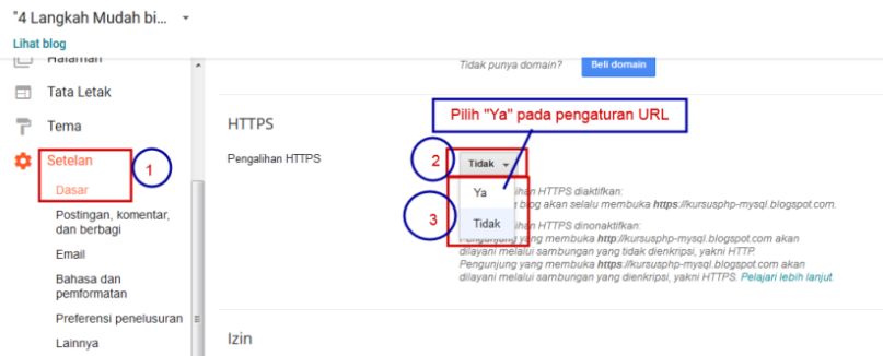 2. Silahkan pilih blog yang ingin kalian sesuaikan menggunakan URL https://, lalu klik menu Setelan > Dasar. Gulir sedikit kebawah, maka kalian akan melihat bagian untuk pengaturan URL, klik tombol "Tidak", lalau rubah atau pilih menjadi "Ya". Setelah itu setiap pengunjung blog kalian akan diarahkan pada url https://, sebagai contoh saat kalian membaca artikel ini pasti url yang tampil pada address bar adalah https://www.multibisnisindo.com/detailpost/ssl